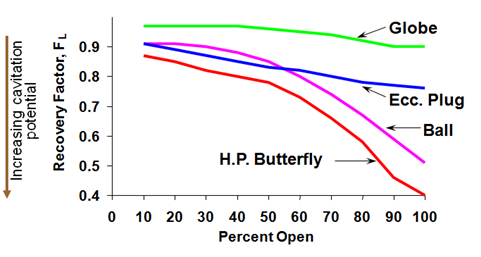 Δ的P值T兩個(gè)工藝條件的函數(shù)(P1,閥門的壓力和P的上游V,液體的蒸氣壓)和閥的內(nèi)部結(jié)構(gòu)由實(shí)驗(yàn)確定的代表液體壓力恢復(fù)系數(shù),F(xiàn)l。典型的F值l如圖6所示。注意fl兩個(gè)閥式和閥門的開度百分比功能。高F值l在有氣蝕閥相關(guān)的低電位,和較小的F值l在有氣蝕閥相關(guān)的更大的潛力。