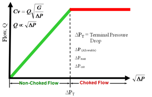 基礎(chǔ)液上漿方程告訴我們,液體流量控制閥是通過壓差的平方根成比例。這個(gè)簡(jiǎn)單的關(guān)系由圖1中的圖顯示綠色部分。(注意,橫軸的規(guī)模是壓降。平方根)這種線性關(guān)系并不總是正確的。當(dāng)壓力降增加,流量達(dá)到一個(gè)點(diǎn),它不再增加。一旦發(fā)生這種情況,通過閥門的壓力降增加的增加不會(huì)導(dǎo)致額外的流量,而流量是窒息。在這里,我們將這稱為限制或窒息的壓力降的終端壓力下降,ΔPT。(同樣的事情,有時(shí)也被稱為允許壓降,ΔP允許的有時(shí),當(dāng)最大壓力降,ΔP馬克斯,有時(shí)為臨界壓降,ΔP暴擊。)