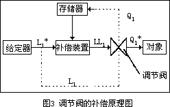 圖3為補(bǔ)償原理圖,調(diào)節(jié)閥的畸變自動(dòng)校正由補(bǔ)償裝置來(lái)完成。給定器根據(jù)理想的流量特性給出閥的開(kāi)度信號(hào)L/L