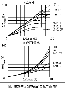 閥門(mén)串接在管路系統(tǒng)中,當(dāng)管路兩端的總壓降固定不變時(shí),管路內(nèi)的直管沿程阻力和管件局部阻力都會(huì)隨流量而變化,其結(jié)果會(huì)使調(diào)節(jié)閥的工作特性與理想特性有許多差異。