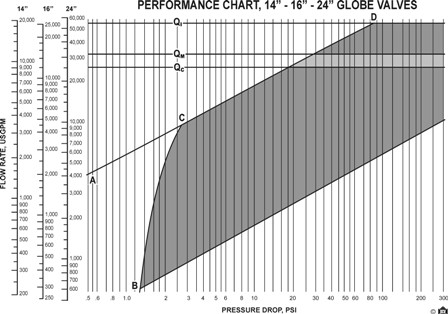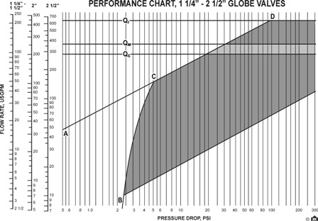 解決方案上游的壓力為20 psi,下游為零。因此,壓降是20 psi。微量向上直到你交叉陰影區(qū)域的下邊緣。然后,微量水平2的流量圖和閱讀21加侖。這是最小流量。現(xiàn)在繼續(xù)向上沿20磅線陰影區(qū)域的上邊緣。微量水平和閱讀210 GPM最大流量。有效的流量范圍內(nèi),然后,是21-210 GPM。