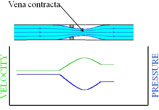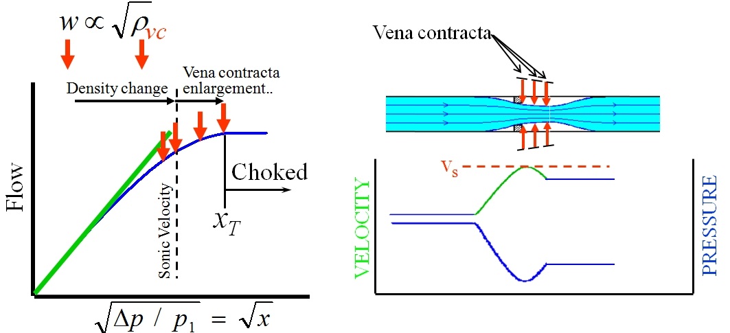 在縮流速度低于音速,的流量曲線與直線的偏差是由密度引起縮減。一次聲波速度達(dá)到,速度,在腔contracta壓力和密度保持不變,但縮退到了物理限制,變得更大,從而使流量增加。當(dāng)腔收縮,最終達(dá)到它的最大大小(因?yàn)樗俣纫呀?jīng)到了最大流扼流圈)。