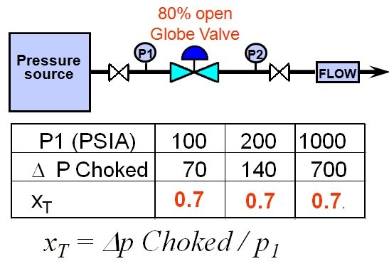 這里的關(guān)鍵是,在一個(gè)特定的程度的閥門行程控制閥的一個(gè)特定的風(fēng)格(在這種情況下,一個(gè)80%打開截止閥的壓力降比)的流動(dòng)變得哽咽是一個(gè)常數(shù)。知道終端壓降比這個(gè)特定的模式截止閥是0.7現(xiàn)在我們可以預(yù)測(cè),如果入口壓力為300 psi,流量會(huì)窒息在210 psi的壓力降(300 x 0.7 = 210)。
