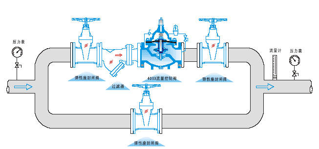 400X流量控制閥由主閥、流量調(diào)節(jié)閥、針閥、導(dǎo)閥、球閥、微形過濾器和壓力表組成水力控制接管系統(tǒng)。利用水力自動操作,控制和調(diào)節(jié)主閥開度,使通過主閥的流量保持不變。